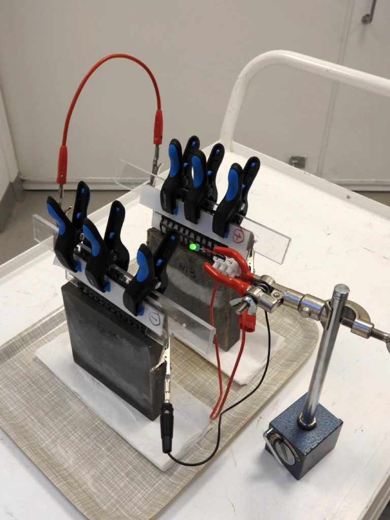 El concepto involucra primero una mezcla a base de cemento, con pequeñas cantidades de fibras de carbono cortas agregadas para aumentar la conductividad y la tenacidad a la flexión. Luego, incrustada dentro de la mezcla hay una malla de fibra de carbono recubierta de metal: hierro para el ánodo y níquel para el cátodo. Después de mucha experimentación, este es el prototipo que ahora presentan los investigadores.
