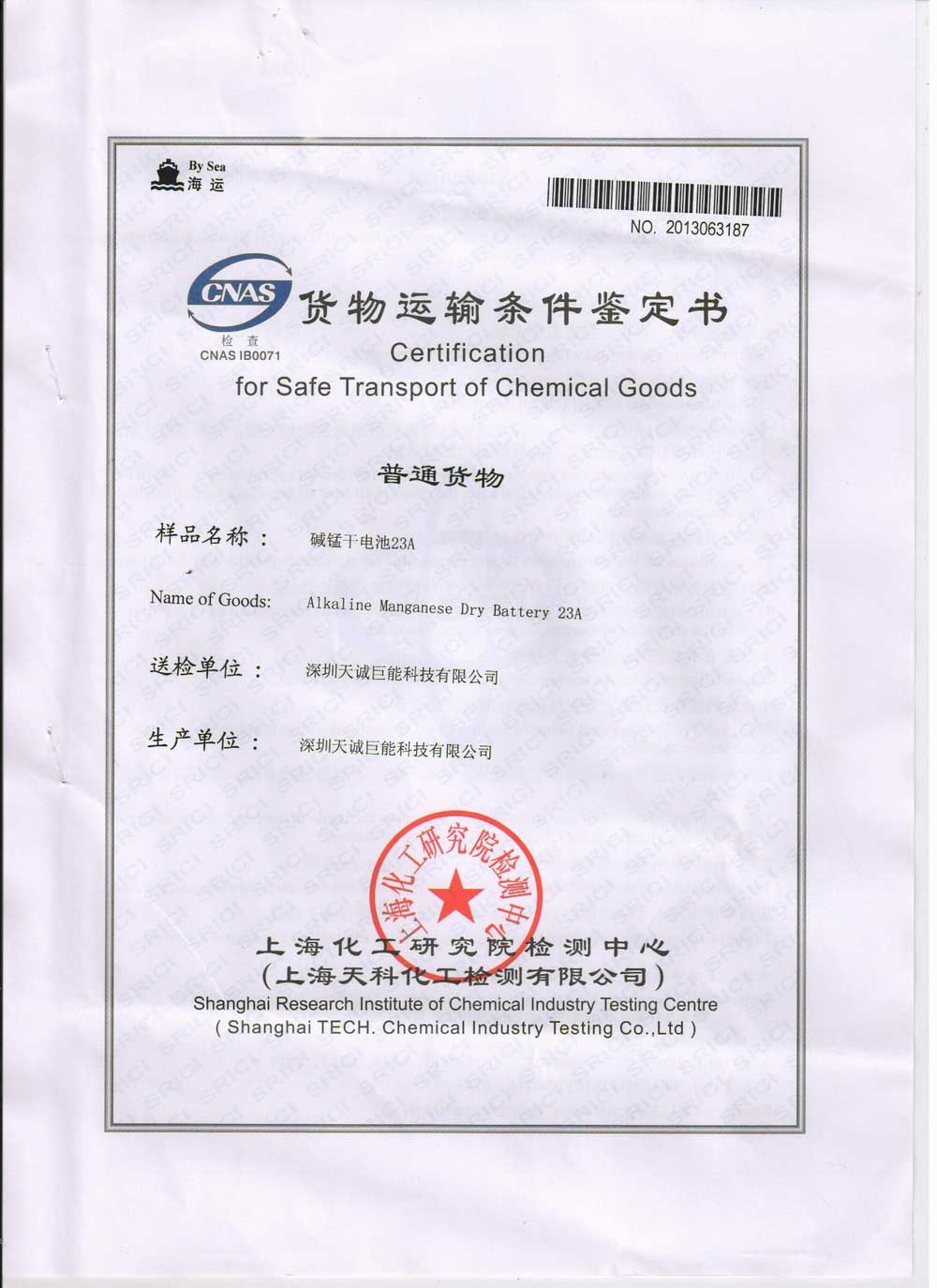 Safe Transport Certificate of Chemical Goods