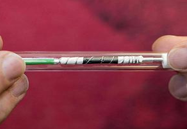 In order to investigate the charging process more precisely, the TUM researchers built a special lithium air battery. The power sinks are thin and arranged in a helix form inside a transparent glass housing. This ensures that microwave radiation and magnetic fields essential for the measurements are not shielded.
