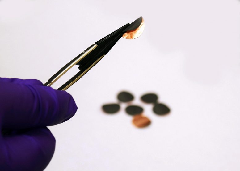 A new method could allow better materials to make up battery electrodes by converting them into a nanochain structure, the black material on this copper electrode of a coin cell. Credit: Purdue University image/Kayla Wiles