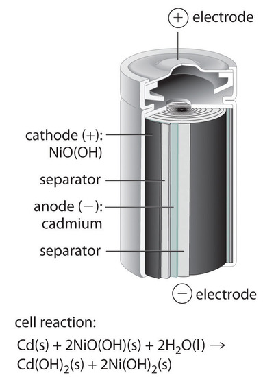 The nickel–cadmium, or NiCad, battery is used in small electrical appliances and devices like drills, portable vacuum cleaners, and AM/FM digital tuners. It is a water-based cell with a cadmium anode and a highly oxidized nickel cathode that is usually described as the nickel(III) oxo-hydroxide, NiO(OH).
