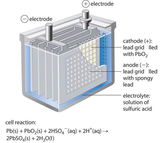 One Cell of a Lead–Acid Battery. The anodes in each cell of a rechargeable battery are plates or grids of lead containing spongy lead metal, while the cathodes are similar grids containing powdered lead dioxide (PbO2). The electrolyte is an aqueous solution of sulfuric acid. The value of E° for such a cell is about 2 V. Connecting three such cells in series produces a 6 V battery, whereas a typical 12 V car battery contains six cells in series. When treated properly, this type of high-capacity battery can be discharged and recharged many times over.