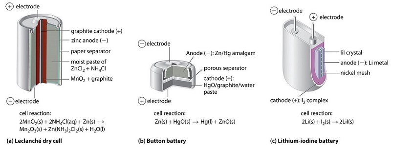 None of the batteries described above is actually “dry.” They all contain small amounts of liquid water, which adds significant mass and causes potential corrosion problems. Consequently, substantial effort has been expended to develop water-free batteries. One of the few commercially successful water-free batteries is the lithium–iodine battery. The anode is lithium metal, and the cathode is a solid complex of . Separating them is a layer of solid , which acts as the electrolyte by allowing the diffusion of Li+ ions.