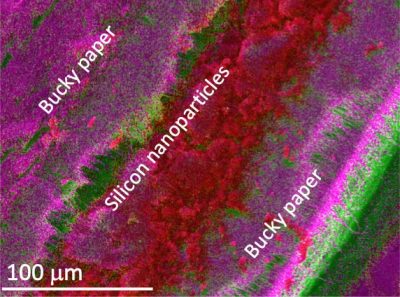 The Clemson team opted to work with silicon, which can pack more charge, meaning more energy can be stored in lighter cells. While scientists have long valued the high capacity of silicon for electrical storage, this material breaks apart into smaller pieces as it charges and discharges. The solution the team came up with involves the use of tiny silicon “nanosized” particles, which increase stability and provide longer cycle life. Rather than a deck of cards made of graphite, the new batteries uses layers of a carbon nanotube material called Buckypaper, with the silicon nanoparticles sandwiched in between.