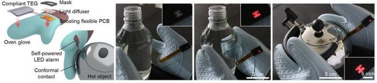 Schematic illustration of hot surface warning gloves with a self-powered LED system and light masking packages. Photographs showing a demonstration of the TEG-attached gloves when they are used to grasp various hot objects such as a bottle and a kettle. The insets show enlarged view of the self-powered system and packages. The conformal contact between the TEG-attached gloves and the 3D surfaces of the heat sources results in a bright “H” sign without any assistance from an external power supply. Scale bars, 5, 5 cm, and 5 mm. Credit: Korea Institute of Science and Technology (KIST)