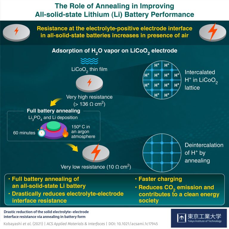 Reference: “Drastic reduction of the solid electrolyte–electrode interface resistance via annealing in battery form” by Shigeru Kobayashi, Elvis F. Arguelles, Tetsuroh Shirasawa, Shusuke Kasamatsu, Koji Shimizu, Kazunori Nishio, Yuki Watanabe, Yusuke Kubota, Ryota Shimizu, Satoshi Watanabe and Taro Hitosugi, 6 January 2022, ACS Applied Materials & Interfaces.