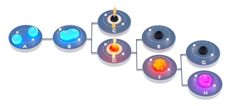 chematic representation of binary neutron star merger outcomes. Panels A and B: Two neutron stars merge as the emission of gravitational waves drives them towards one another.